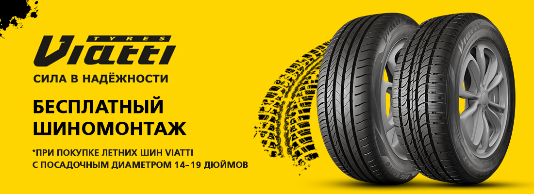 При покупке комплекта летних шин (от 4-х шт.) бренда VIATTI с посадочным диаметром 14-19 дюймов – ШИНОМОНТАЖ В ПОДАРОК!